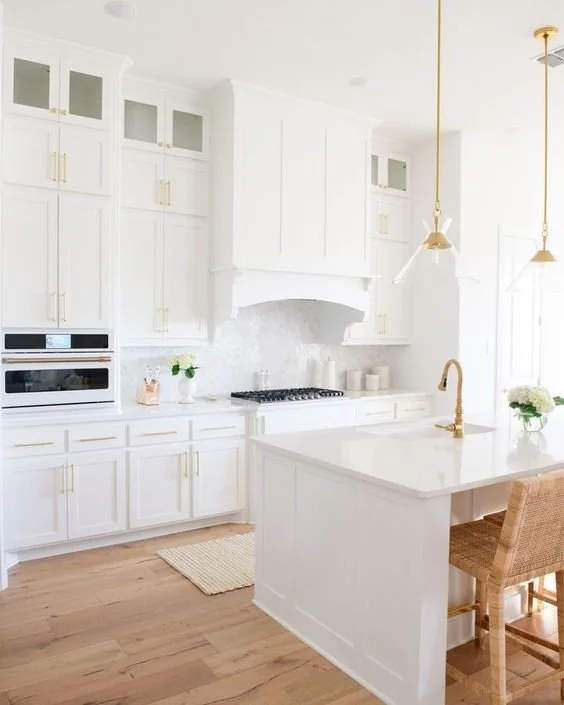 After going through hundreds of kitchen inspiration photos on Pinterest and Instagram, I was really struggling with my vision for our kitchen. I knew I wanted the same minimalistic vibe as our kitchen now, but wanted to warm it up a bit. In our townhome, we have light grey cabinets, grey and white countertops, gray floors, and matte black hardware. And while I really love the look, I’m just REALLY over gray and cool tones right now.